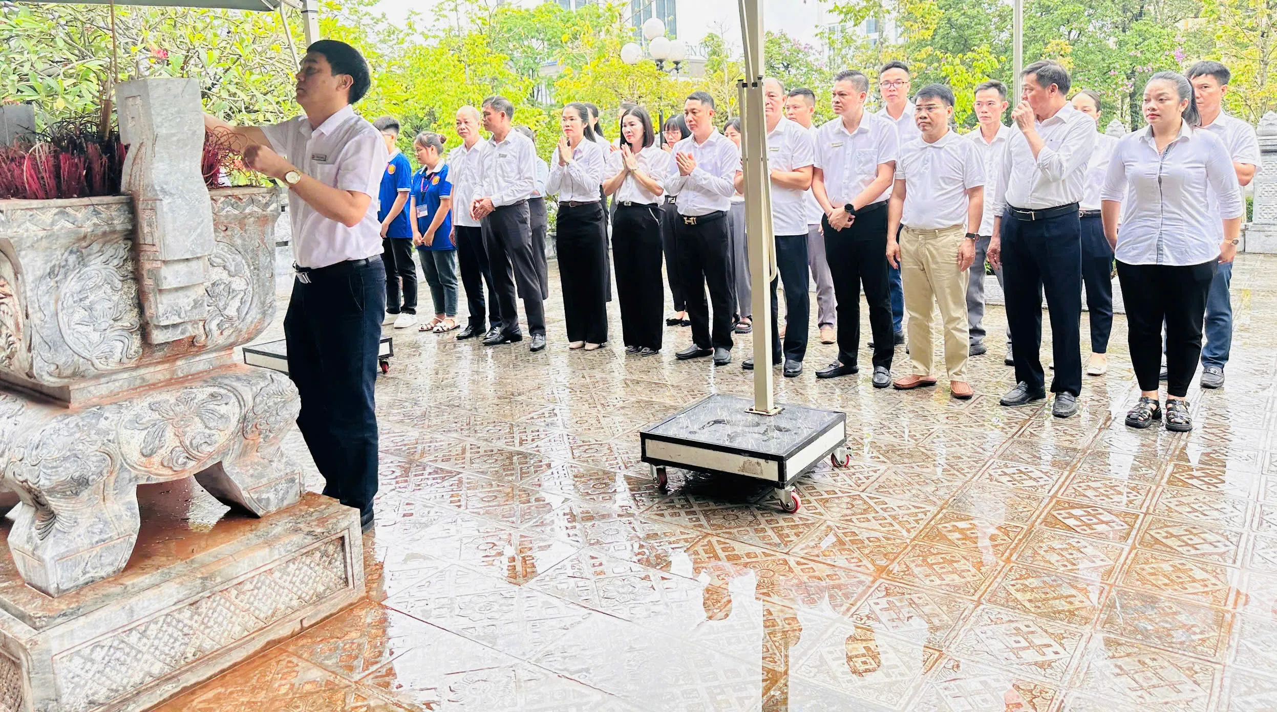 Các đồng chí đại biểu sắp lễ, dâng hương bên ngoài Đền thờ Bác Hồ
