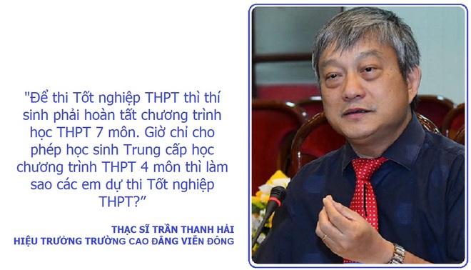 Thạc sĩ Trần Thanh Hải, Hiệu trưởng trường Cao đẳng Viễn Đông, thắc mắc: "Để thi Tốt nghiệp THPT thì thí sinh phải hoàn tất chương trình học THPT 7 môn. Giờ chỉ cho phép học sinh Trung cấp học chương trình THPT 4 môn thì làm sao các em dự thi Tốt nghiệp THPT?".