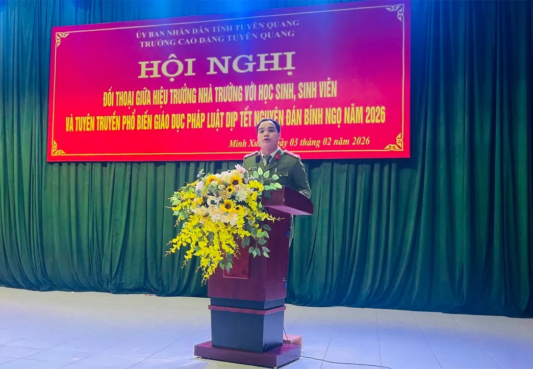 Thực hiện kế hoạch năm học 2025–2026 và nhằm tăng cường mối quan hệ gắn bó, lắng nghe tâm tư, nguyện vọng của học sinh, sinh viên, đồng thời đẩy mạnh công tác tuyên truyền, giáo dục pháp luật trong dịp Tết Nguyên đán Bính Ngọ 2026, Trường Cao đẳng Tuyên Quang đã tổ chức Hội nghị đối thoại giữa Hiệu trưởng với học sinh, sinh viên và kết hợp với cơ quan công an tỉnh thực hiện tuyên truyền, giáo dục pháp luật.