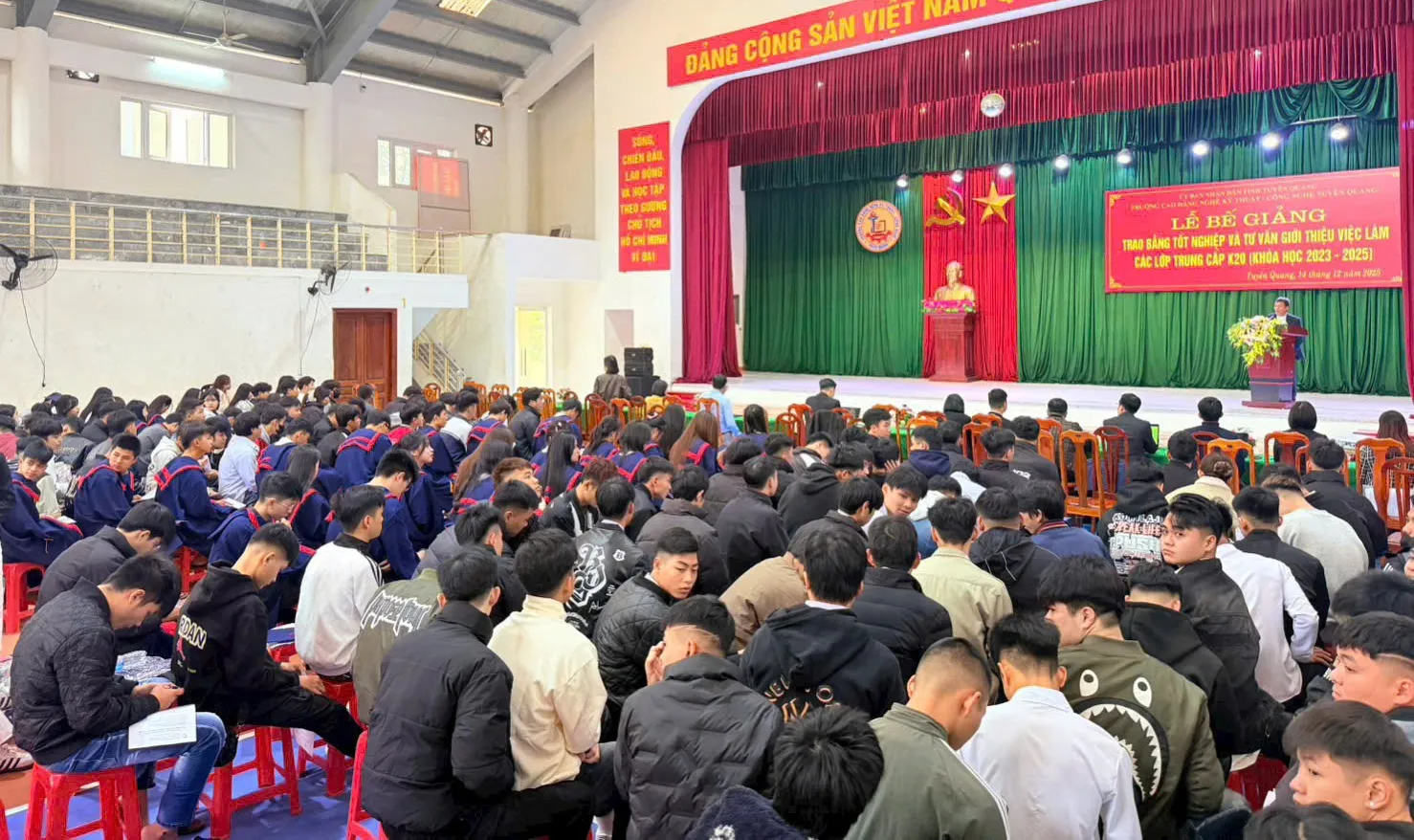 Sáng ngày 14 tháng 12 năm 2025, Trường Cao đẳng nghề Kỹ thuật – Công nghệ Tuyên Quang đã long trọng tổ chức Chương trình Bế giảng, trao bằng tốt nghiệp và Tư vấn giới thiệu việc làm cho học sinh Trung cấp khóa 20 (niên khóa 2023 - 2025). Sự kiện ý nghĩa này không chỉ tổng kết quá trình đào tạo mà còn kết nối học sinh với thị trường lao động trong nước và quốc tế, mở ra cơ hội việc làm bền vững.