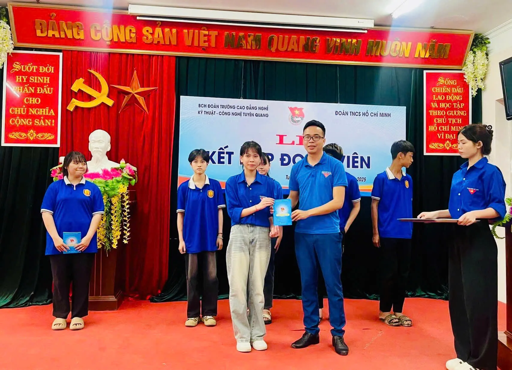 Đây là hoạt động ý nghĩa nhằm chào mừng kỷ niệm 135 năm ngày sinh Chủ tịch Hồ Chí Minh (19/5/1890-19/5/2025) và hướng tới Đại hội Đoàn các cấp. 90 học sinh, sinh viên của trường Cao đẳng nghề Kỹ thuật – Công nghệ Tuyên Quang được kết nạp đoàn viên là những thanh niên ưu tú, có phẩm chất, đạo đức tốt, có nhiều cố gắng, nỗ lực trong học tập; việc được kết nạp vào hàng ngũ Đoàn thanh niên cộng sản Hồ Chí Minh đã đánh dấu bước trưởng thành lớn lao trong quá trình học tập và tu dưỡng đạo đức chính trị của các em. Mở ra cho các em nhiều cơ hội tham gia các hoạt động phong trào rèn luyện sức khỏe, giao lưu với các đơn vị, tham gia rèn luyện hoạt động kỹ năng số, kỹ năng nghề nghiệp và đây cũng là bước mở đầu để các em có cơ hội được đứng trong hàng ngũ của Đảng cộng sản Việt Nam.