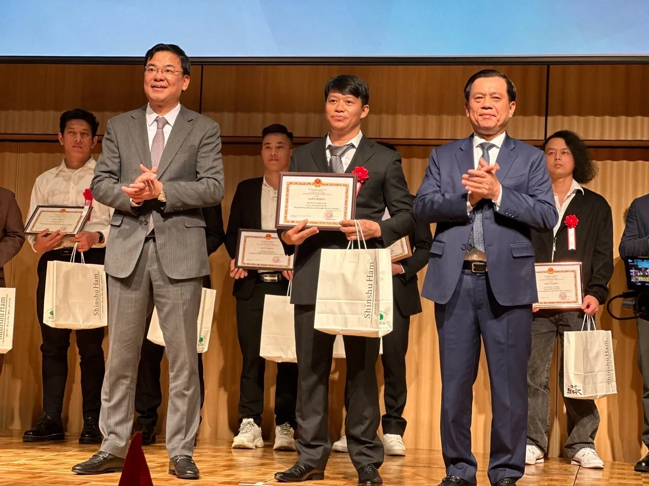 Nhân dịp này, Đại sứ Phạm Quang Hiệu và Thứ trưởng Nguyễn Bá Hoan đã trao giấy khen cho 30 lao động Việt Nam, 12 đoàn thể quản lý và 17 công ty tiêu biểu của Nhật Bản vì những thành tích xuất sắc và những đóng góp tích cực cho hợp tác lao động song phương.