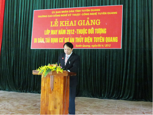 Đ/c Nguyễn Quốc Quân - Bí thư chi bộ, Hiệu trưởng nhà trường, Phát biểu khai giảng tại Lễ khai giảng các lớp nghề May K1-2012, thuộc đối tượng di dân tái định cư dự án thuỷ điện Tuyên Quang.