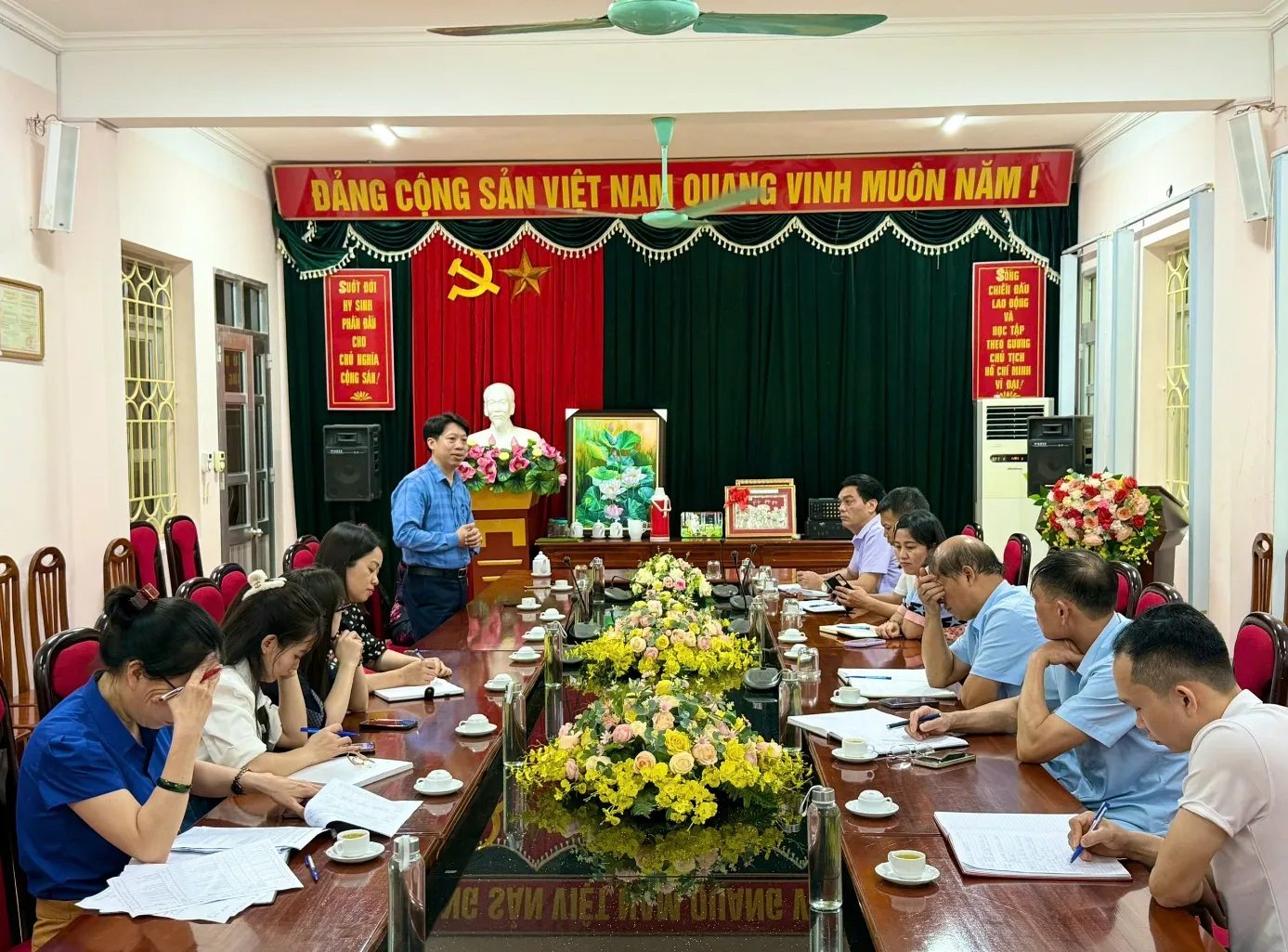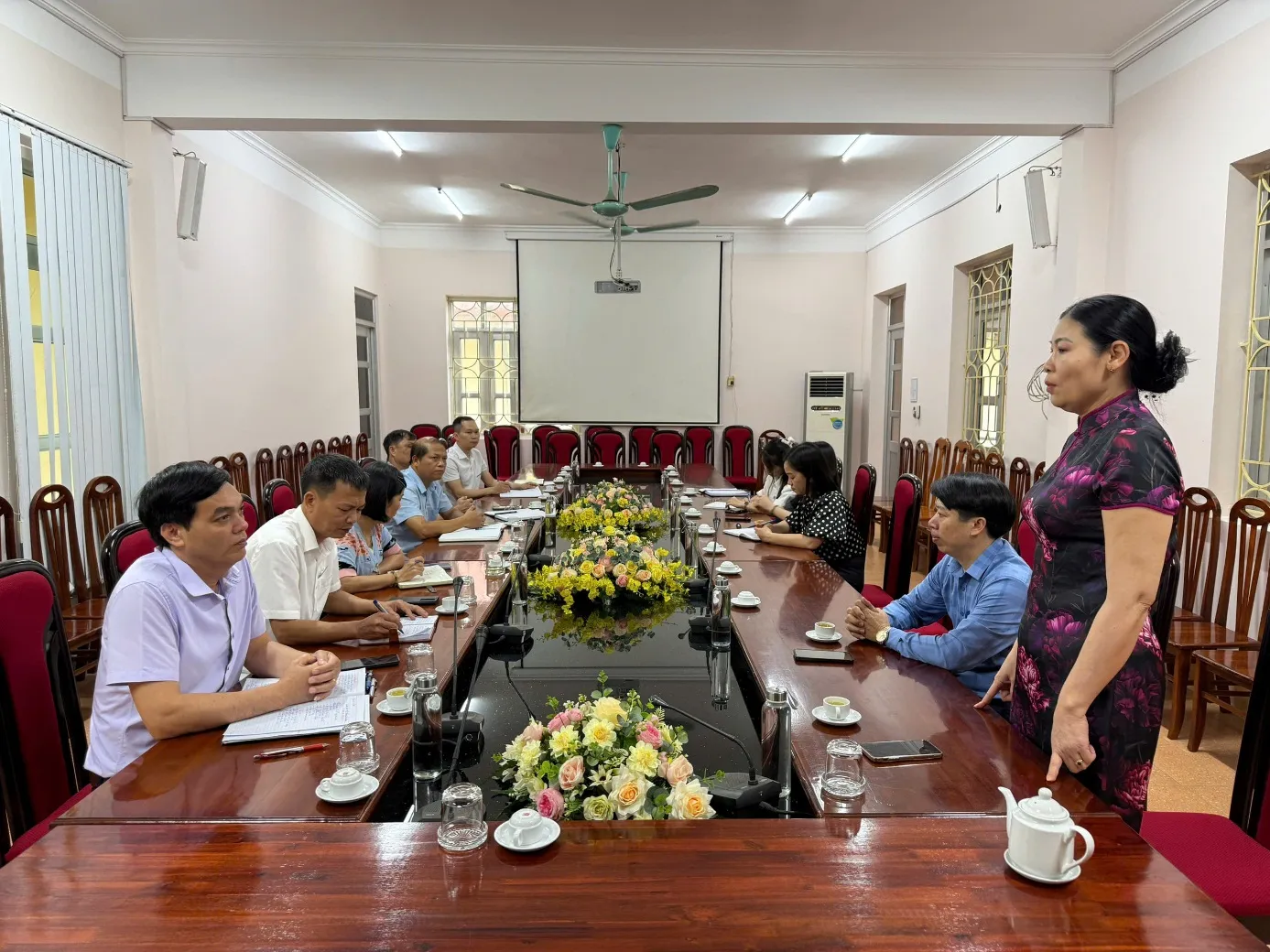 Thầy giáo Đỗ Xuân trường, Bí thư Đảng ủy, Hiệu trưởng Trường Cao đẳng nghề Kỹ thuật - Công nghệ Tuyên Quang trao đổi tại buổi làm việc