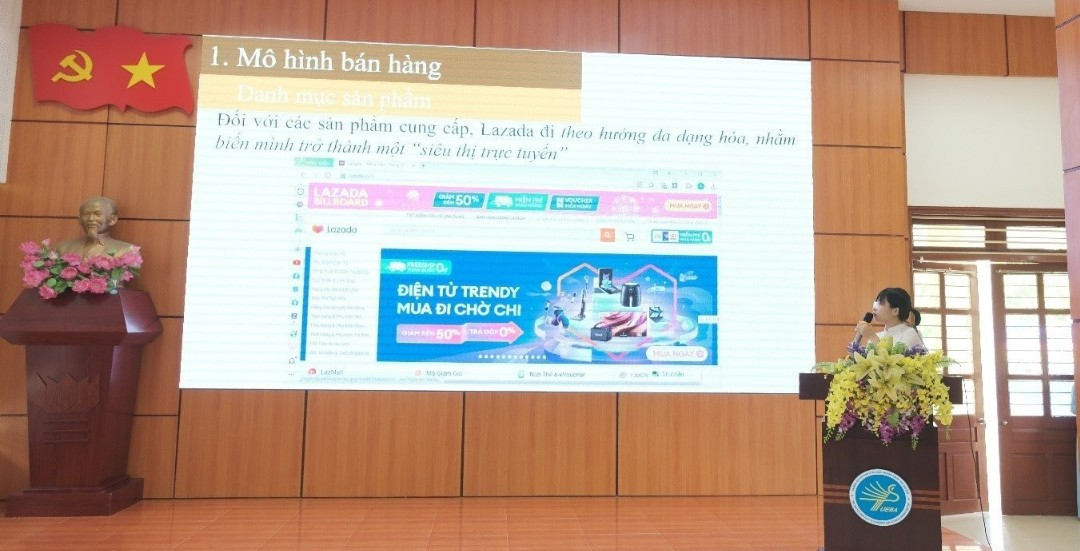 Sinh viên Đinh Thị Sen, lớp K18 QTKD3, Chủ nhiệm đề tài “Nghiên cứu mô hình thương mại điện tử Lazada tại Việt Nam”, đạt Giải Ba, vòng Chung kết