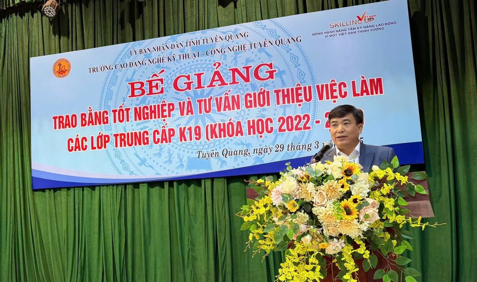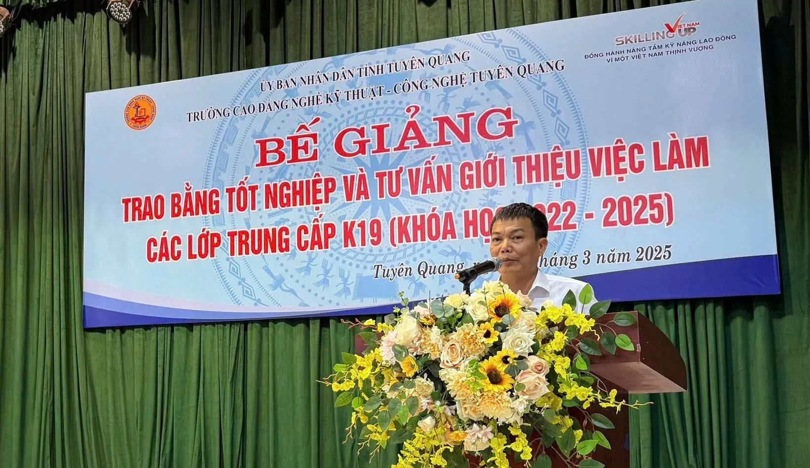 Ông Hoàng Quang Trung, Phó Chủ tịch Thường trực Hiệp hội Doanh nghiệp tỉnh Tuyên Quang, Chủ tịch Hội đồng quản trị Công ty Cổ phần đầu tư và xây dựng Trung Thành tái khẳng định: "Hiệp hội Doanh nghiệp tỉnh Tuyên Quang luôn đồng hành cùng Nhà trường trong quá trình đào tạo và tuyển dụng HSSV tốt nghiệp", Ông mong muốn các em HSSV đã, sẽ tốt nghiệp các ngành nghề đào tạo của Trường sẽ tham gia vào hoạt động sản xuất kinh doanh của các doanh nghiệp trong tỉnh, góp phần xây dựng quê hương Tuyên Quang giàu mạnh.