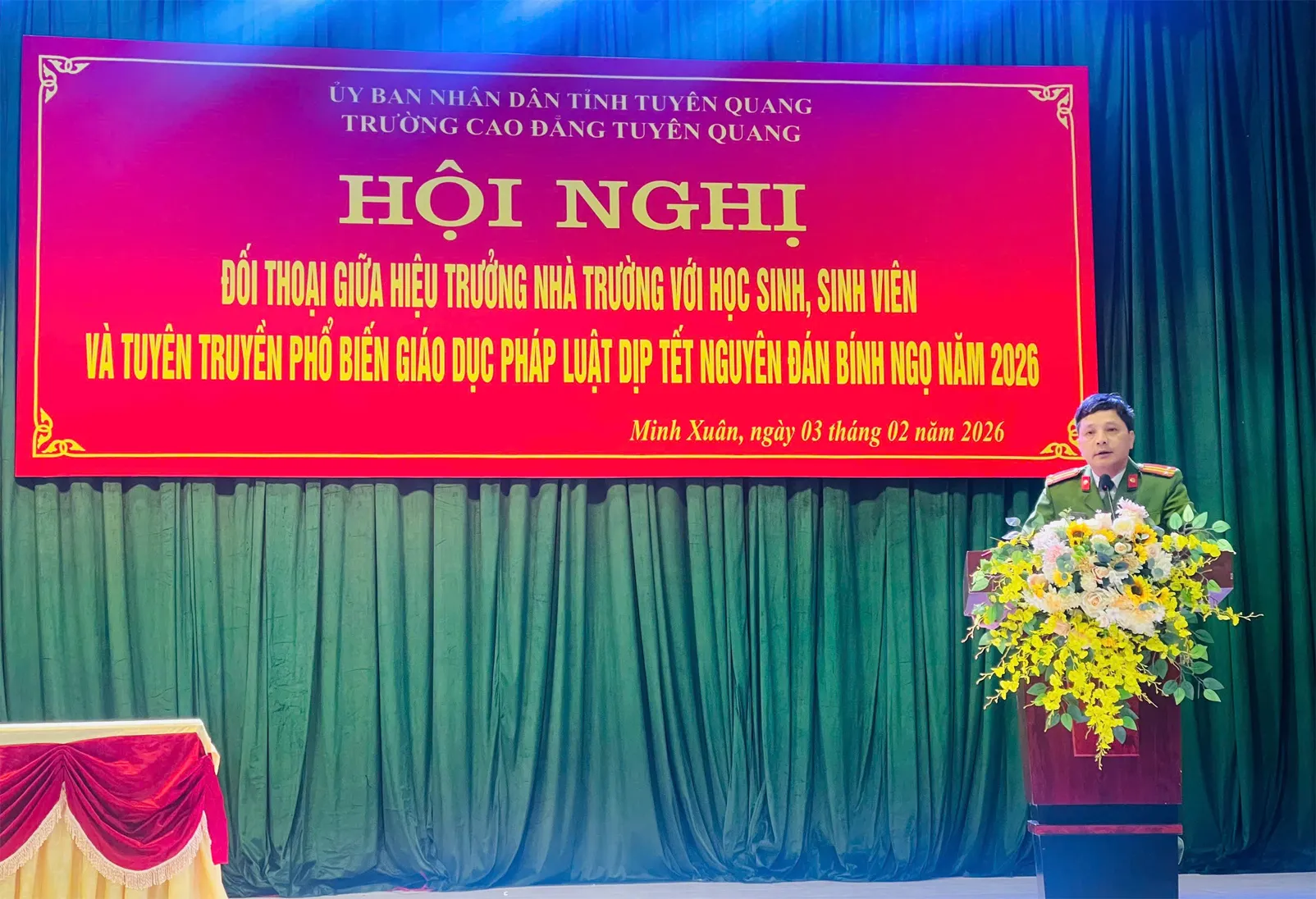 Thực hiện kế hoạch năm học 2025–2026 và nhằm tăng cường mối quan hệ gắn bó, lắng nghe tâm tư, nguyện vọng của học sinh, sinh viên, đồng thời đẩy mạnh công tác tuyên truyền, giáo dục pháp luật trong dịp Tết Nguyên đán Bính Ngọ 2026, Trường Cao đẳng Tuyên Quang đã tổ chức Hội nghị đối thoại giữa Hiệu trưởng với học sinh, sinh viên và kết hợp với cơ quan công an tỉnh thực hiện tuyên truyền, giáo dục pháp luật.