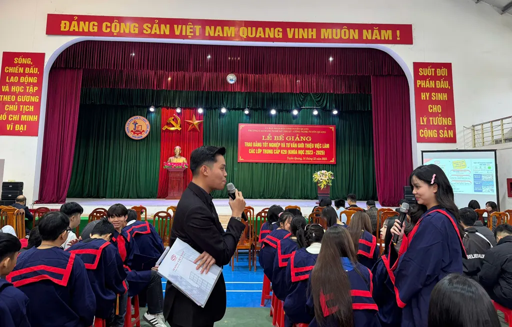 Sáng ngày 14 tháng 12 năm 2025, Trường Cao đẳng nghề Kỹ thuật – Công nghệ Tuyên Quang đã long trọng tổ chức Chương trình Bế giảng, trao bằng tốt nghiệp và Tư vấn giới thiệu việc làm cho học sinh Trung cấp khóa 20 (niên khóa 2023 - 2025). Sự kiện ý nghĩa này không chỉ tổng kết quá trình đào tạo mà còn kết nối học sinh với thị trường lao động trong nước và quốc tế, mở ra cơ hội việc làm bền vững.
