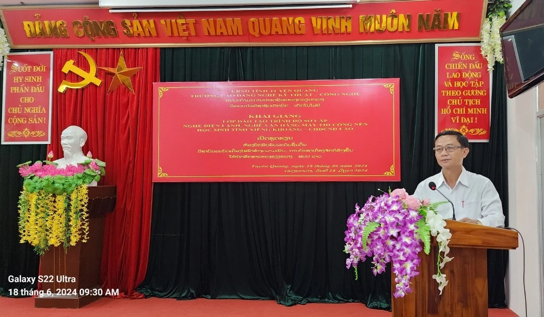 Nhân danh Ban phụ trách lĩnh vực nghề nghiệp của tỉnh Xiêng Khoảng, đồng chí Bun Không Đuông Pha Văn, Hiệu trưởng trưởng Cao đẳng Kỹ thuật nghề tổng hợp tỉnh Xiêng Khoảng bày tỏ lời biết ơn sâu sắc và chân thành tới Đảng - Nhà nước Việt Nam, lãnh đạo tỉnh Tuyên Quang và Ban Giám hiệu, các thầy cô giáo Trường Cao đẳng nghề Kỹ thuật - Công nghệ Tuyên Quang đã tận tình giúp đỡ tỉnh Xiêng Khoảng trên mọi lĩnh vực, trong đó có công tác đào tạo nguồn nhân lực. Từ năm 2021 đến nay, Trường Cao đẳng nghề Kỹ thuật - Công nghệ Tuyên Quang đã đào tạo được 3 khóa với tổng số 30 học sinh là người Lào, 100% học viên sau khi tốt nghiệp, đã tìm được việc làm tại các Công ty, Doanh nghiệp của Lào với mức thu nhập cao.