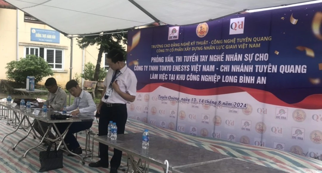 Ngày 13, 14/8/2024, Trường Cao đẳng nghề Kỹ thuật – Công nghệ Tuyên Quang phối hợp với Công ty Cổ phần xây dựng nhân lực Giavi Việt Nam tổ chức phỏng vấn, thi thực hành để tuyển dụng nhân công đã qua đào tạo nghề vào làm việc cho Công ty TNHH Tokyo Enesys Việt Nam tại Nhà máy nhiên liệu sinh khối Erex Sakura Biomass Tuyên Quang, Khu Công nghiệp Long Bình An, thành phố Tuyên Quang. Đây là Nhà máy có vốn đầu tư của doanh nghiệp Nhật Bản, được thiết kế có công suất 150.000 tấn viên nén sinh khối mỗi năm với số nhân công vận hành dự kiến 50 người, được khởi công ngày 06/3/2024 dự kiến đi vào vận hành từ tháng 11/2024. Công ty Cổ phần xây dựng nhân lực Giavi Việt Nam là đơn vị tư vấn tuyển dụng lao động vào làm việc tại Nhà máy nhiên liệu sinh khối Erex Sakura Biomass Tuyên Quang.