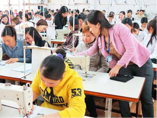 Giáo viên hướng dẫn học sinh học thực hành nghề may.