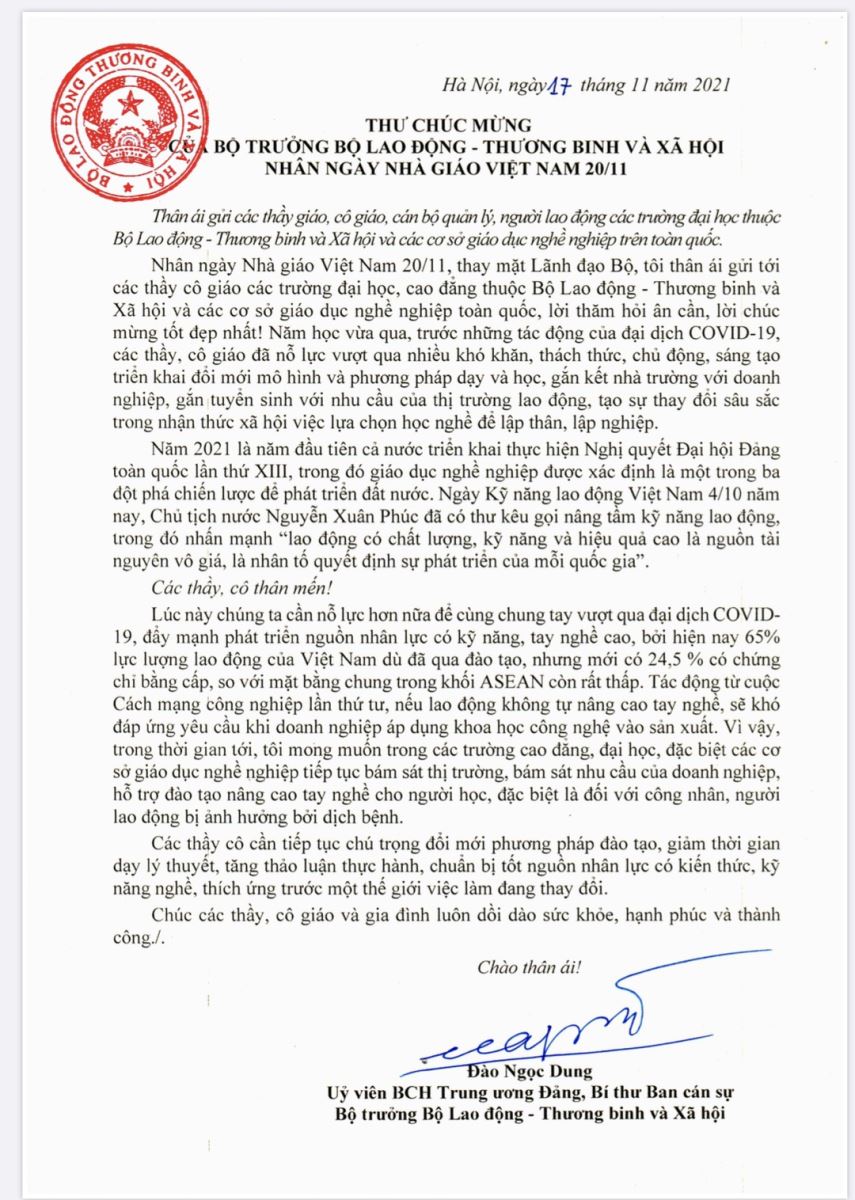 Thư chúc mừng ngày nhà giáo Việt Nam 20/11 của bộ trưởng Bộ lao động - Thương binh và xã hội