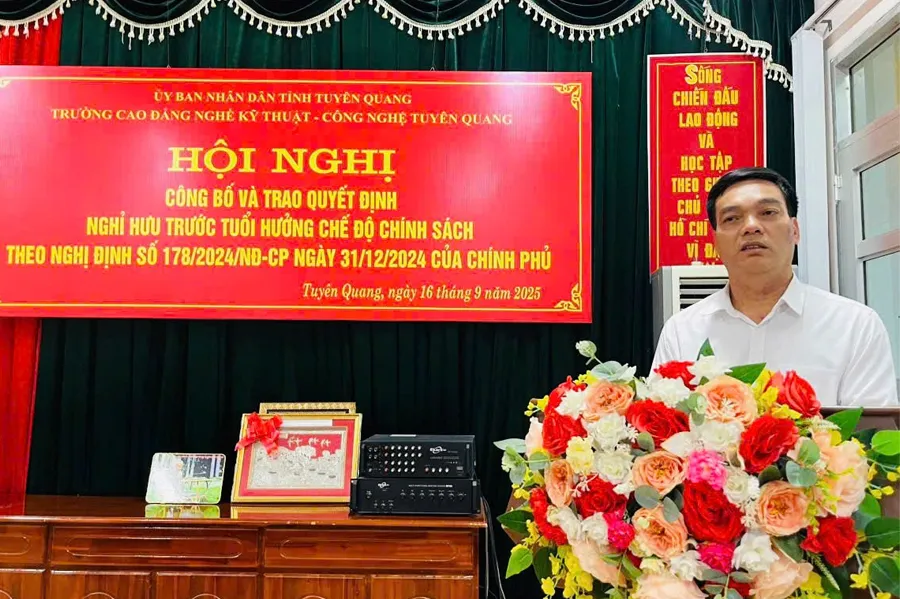 Chiều ngày 16/9, Đảng ủy, Ban Giám hiệu trường Cao đẳng nghề Kỹ thuật – Công nghệ Tuyên Quang tổ chức Hội nghị công bố và trao quyết định nghỉ hưu trước tuổi hưởng chế độ chính sách theo Nghị định số 178/2024/NĐ-CP ngày 31/12/2024 của Chính phủ cho 07 viên chức Nhà trường.